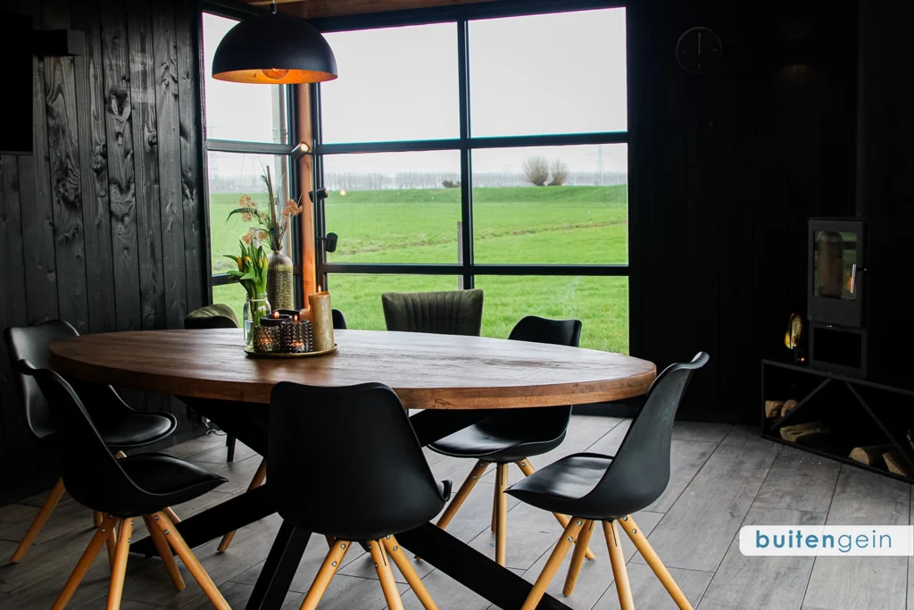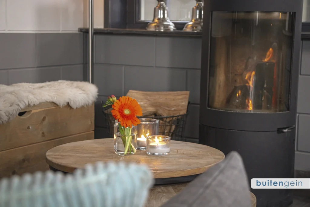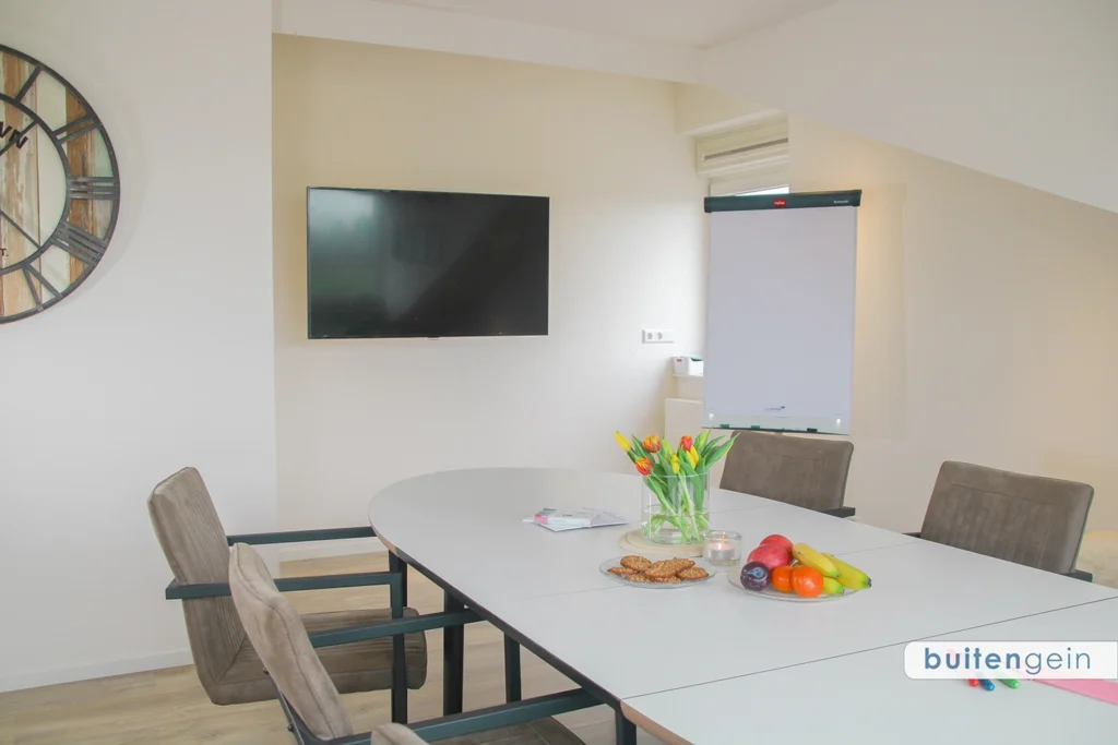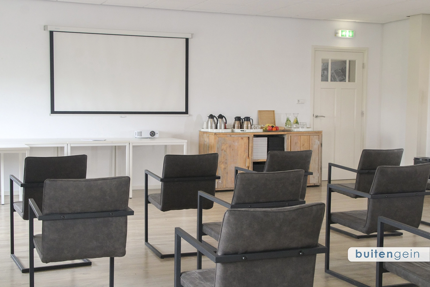 Buitengein beschikt over een sfeervolle ontvangstruimte met een bar en een fijne zithoek met houtkachel. Boven zijn er 2 vergaderruimtes, een kitchenette en toiletten. Daarnaast is er nog een sfeervolle tuinkamer met uitzicht over de weilanden.