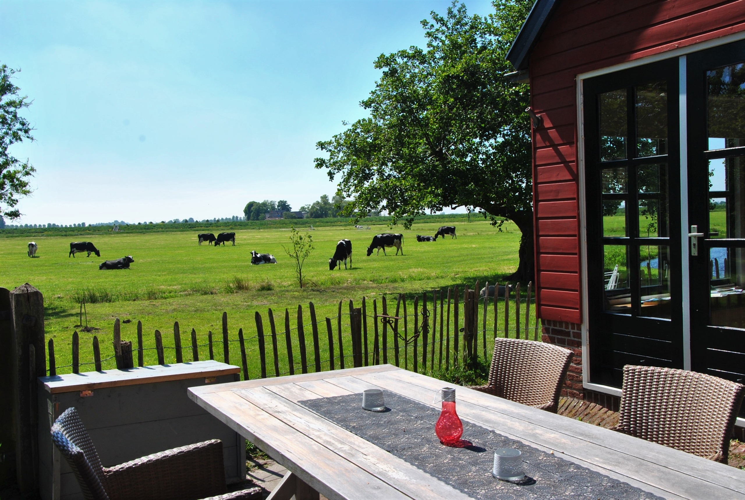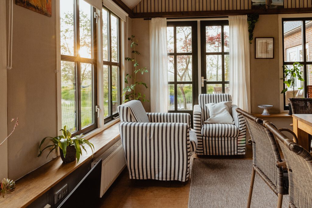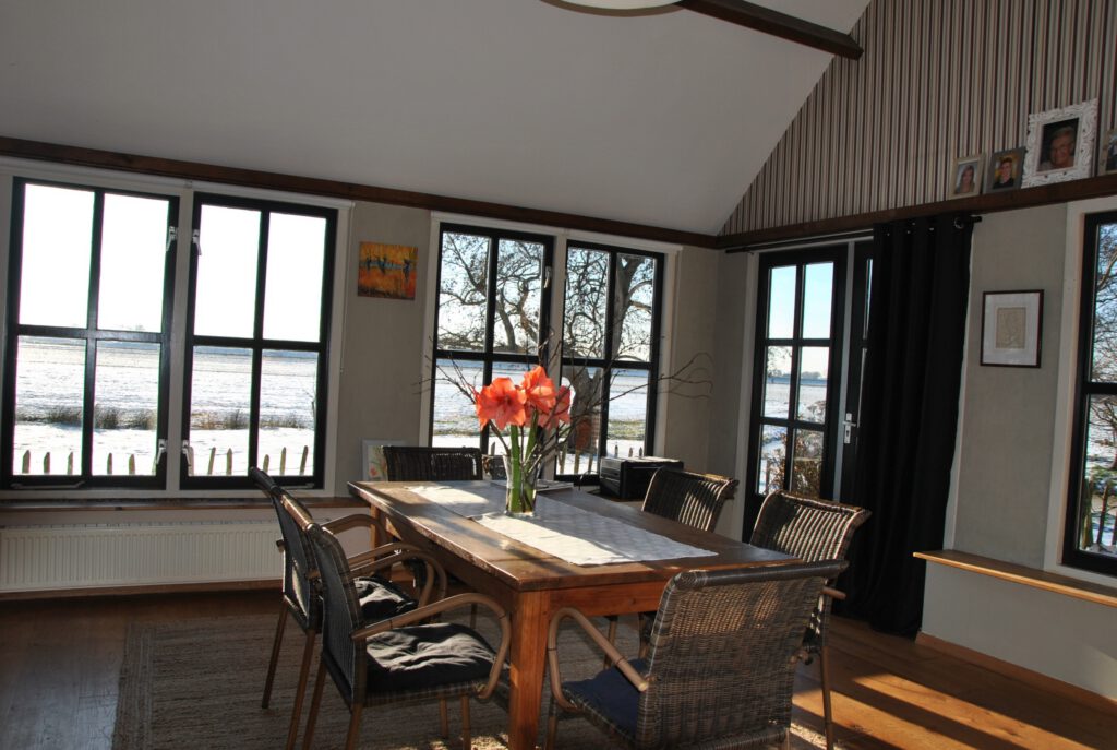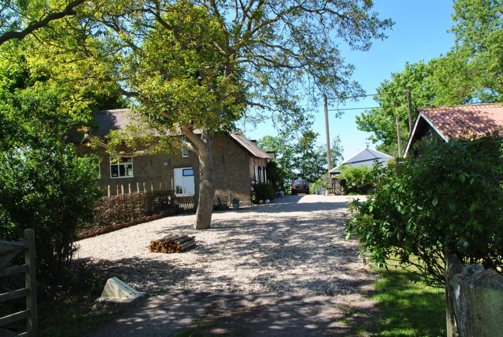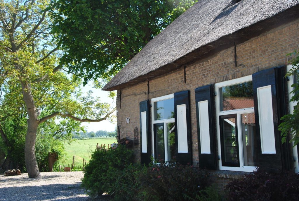 Onze boerderij is gebouwd op een historische kreekrug waardoor deze niet weg zakt in het veen. De voorkant met luiken is echt oud met nog een historische melkkelder. Het achterste deel is in 2000 gebouwd met de oude stalbinten er nog in. Aan alle kanten bevinden zich ramen waardoor er altijd zicht is op het groene landschap.