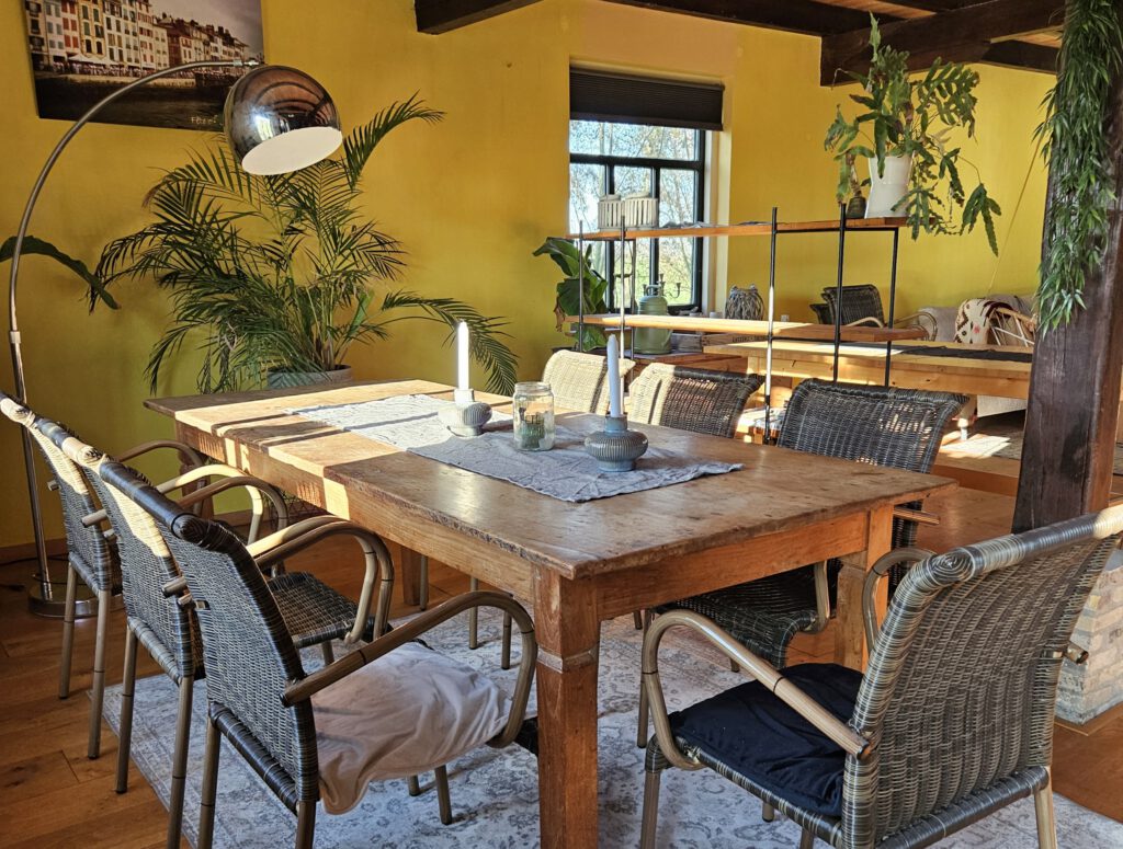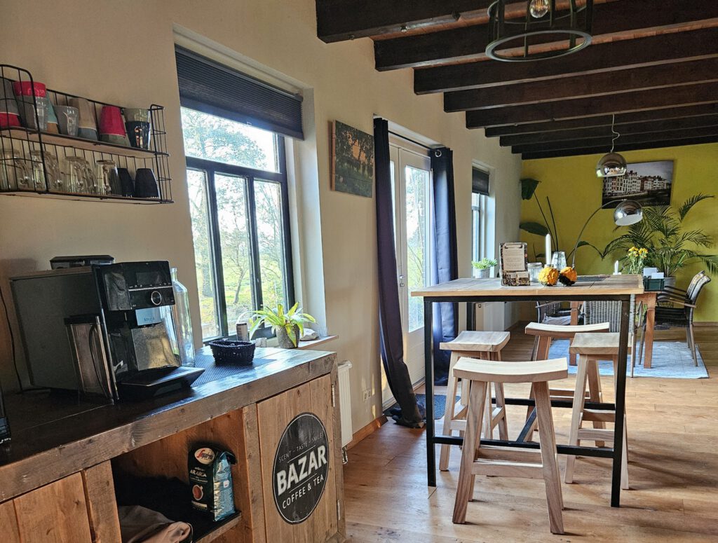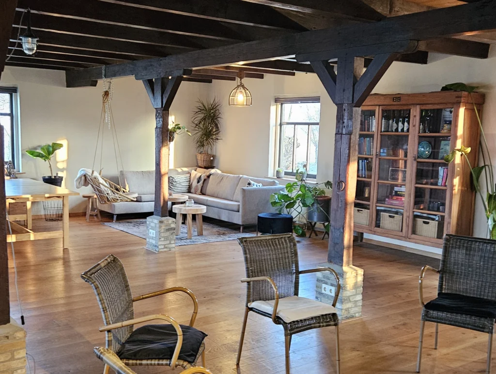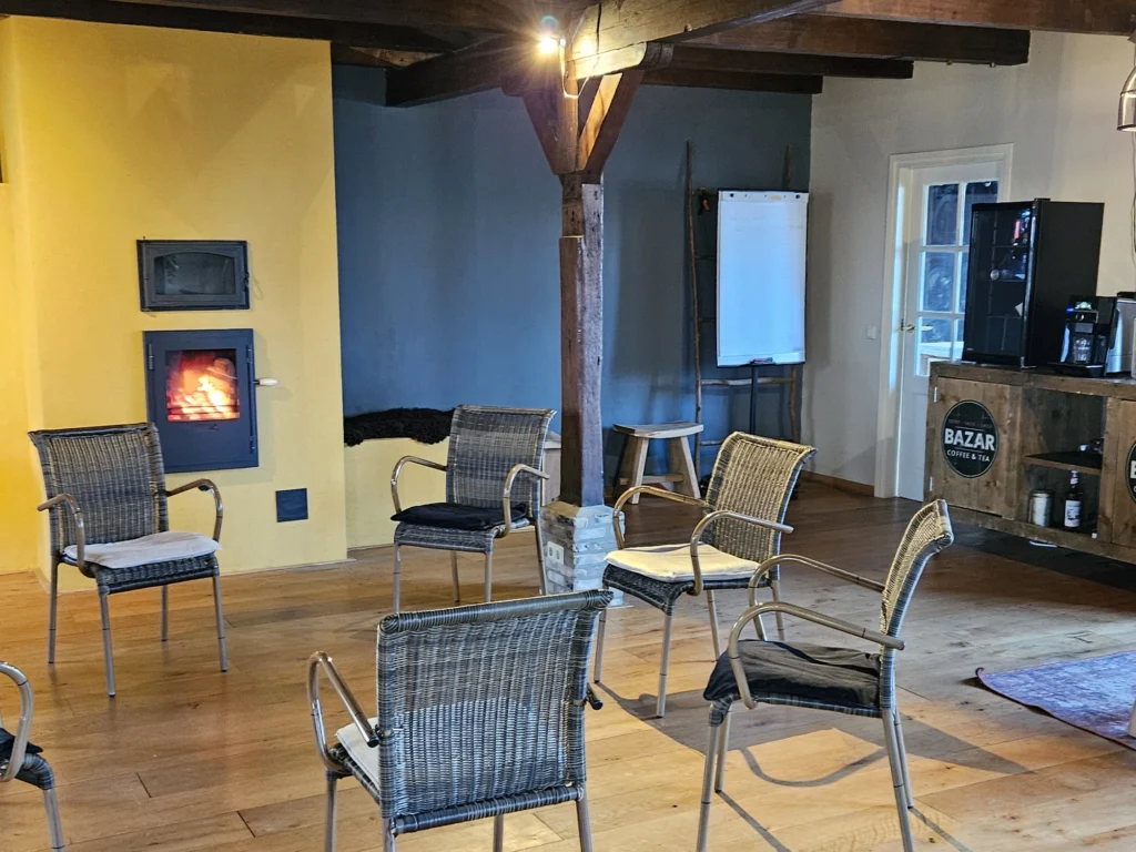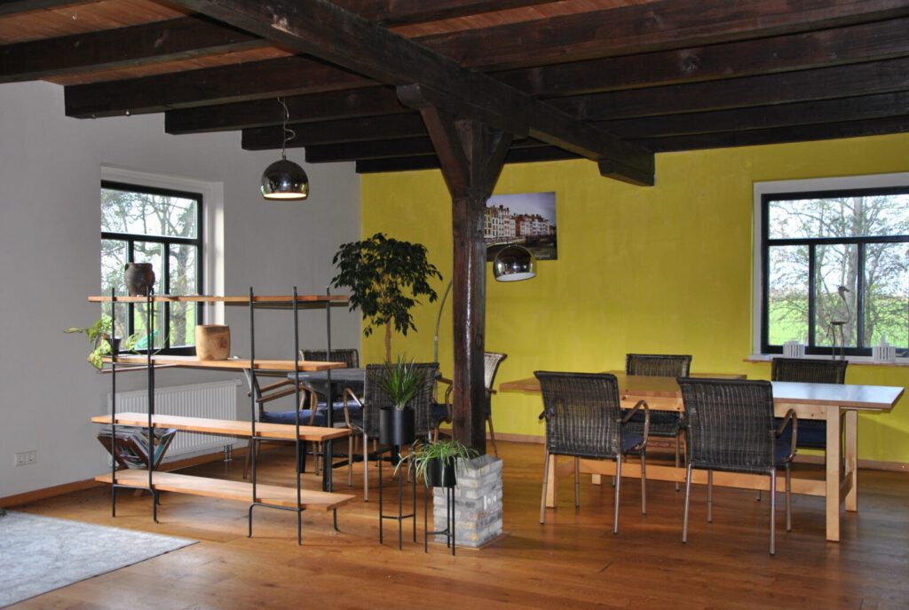 Een tuinkamer (voor 2-4 personen) en een huiskamer (voor max 15 personen) met hierin ook 2 aparte zitjes om in groepjes te werken. Door de openslaande deuren stap je zo op het terras. Ook de buitenruimte/hooiberg kan prima benut worden voor overlegmomentjes. We verhuren slechts aan 1 groep tegelijk. De boerderij wordt duurzaam verwarmd met een warmtepomp en zonnepanelen.