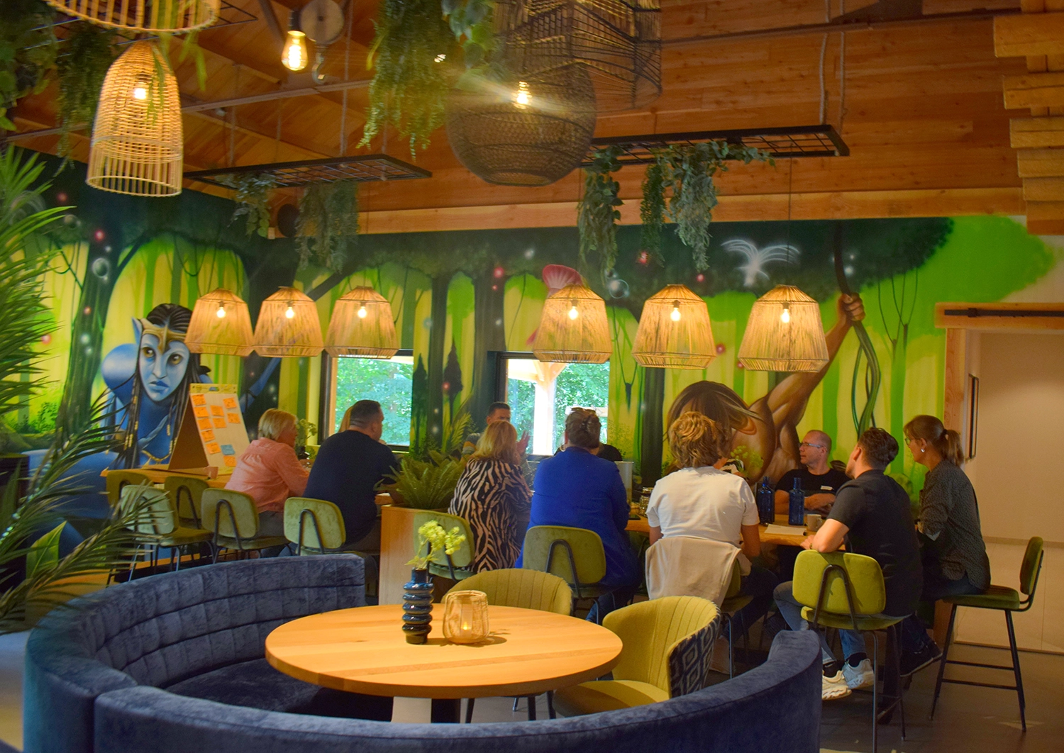 De inspirerende naam van de vergaderruimte, Eywa lounge, past geheel bij onze locatie AvaTarZ. De sfeervolle verlichting en de vele beplanting kleuren het geheel natuurlijk groen af. Op een passende muurschildering vind je tenslotte de oorsprong van onze AvaTarZ helden terug. De lounge is zeer geschikt voor inspiratiesessies, vergaderingen, workshops of strategiedagen.