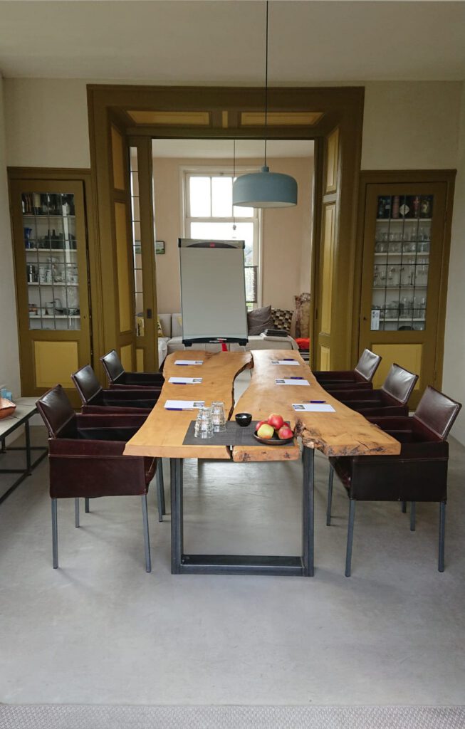 Comfortabele vergaderruimte (ook zelfstandig te huur voor kleine groepen) met een vergadertafel voor 8 personen, loungehoek en open keuken. Openslaande deuren bieden toegang tot de buitenruimte met een besloten terras.