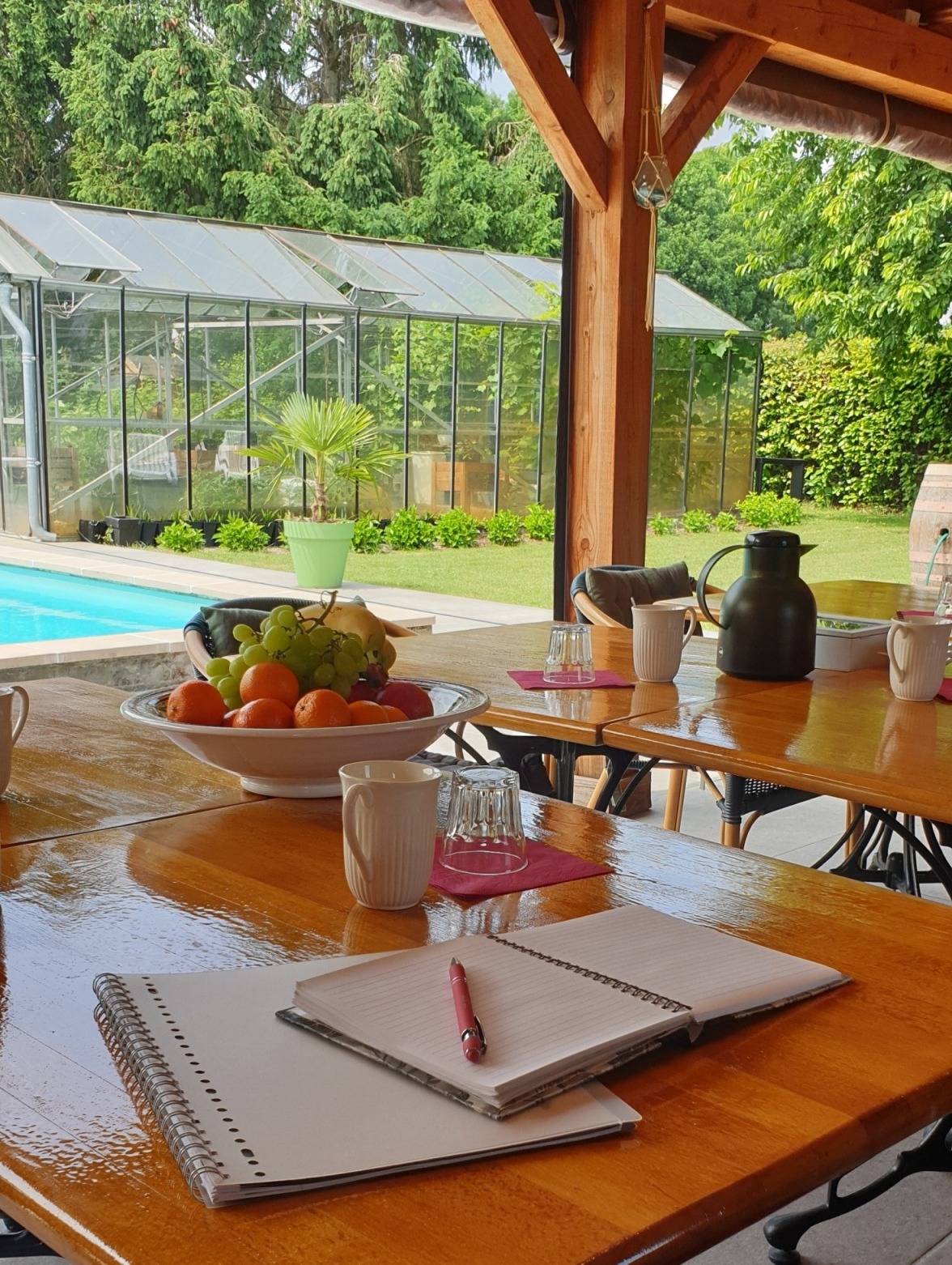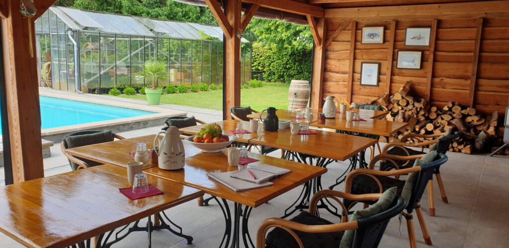 Rust & ruimte, aan de rand van het zwembad met uitzicht op ’t groen en in de hoek een knusse kachel. Kortom, een inspirerende plek waar de mooiste plannen gesmeed kunnen worden. La bienvenue is een kleinschalige accommodatie met 100% privacy gegarandeerd. De vergaderlocatie is exclusief voor jou gereserveerd!
