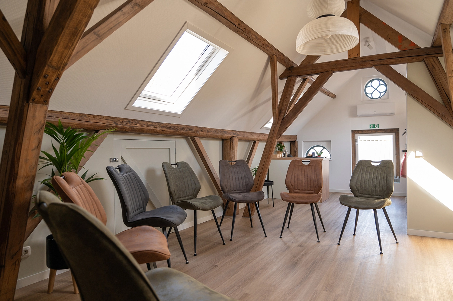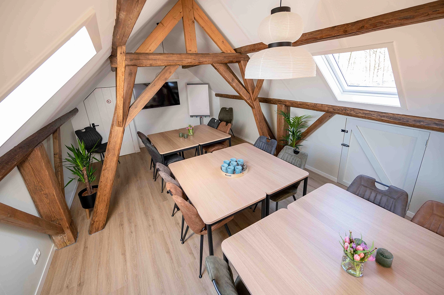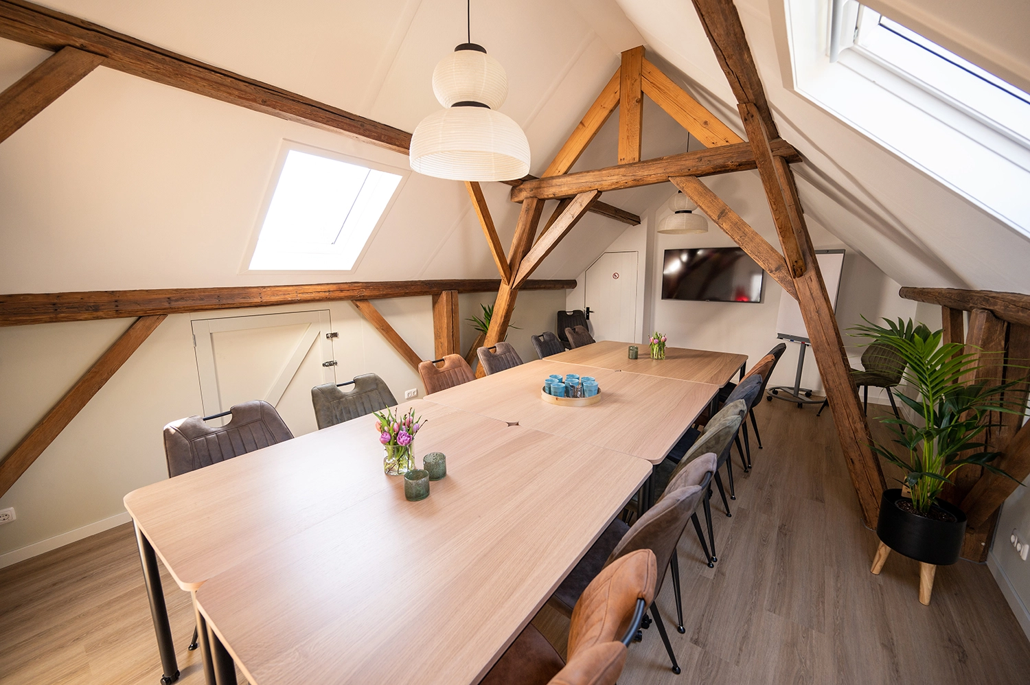 De ruimte is geschikt voor groepen tot 15 personen, de mogelijke groepsgrootte verschilt per opstelling. Altijd exclusief, kleinschalig vergaderen dus.