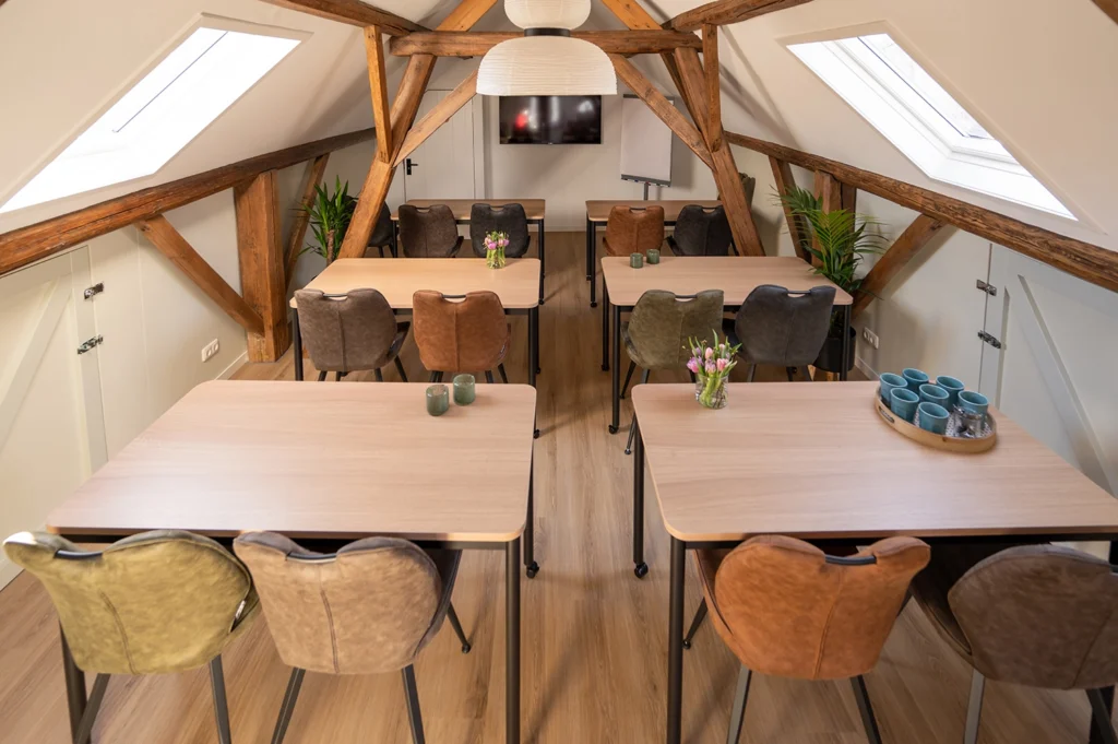 De vergaderruimte is op de 1e verdieping (er is geen lift). Er kan onbeperkt gebruik gemaakt worden van koffie en thee (zelfbediening). De fijne stoelen maken het prettig zitten en de handige tafels kunnen gemakkelijk in allerlei opstellingen gezet worden.