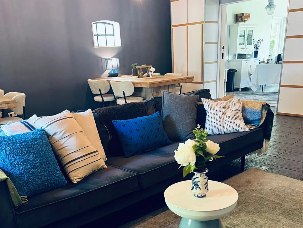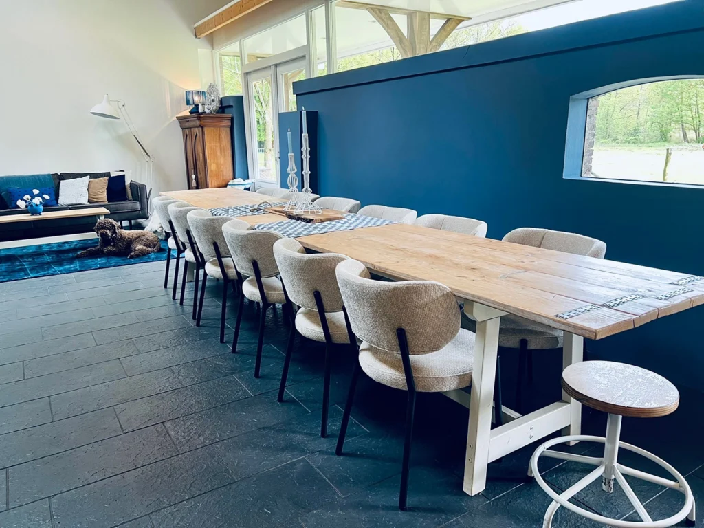De huiskamer wordt altijd exclusief verhuurd, wat zorgt voor volledige privacy. Ondanks de centrale ligging, aan de rand van Amersfoort in het hart van Nederland, ervaart u door de lange oprijlaan en de bosrijke omgeving een gevoel van volledige rust en afzondering. Het interieur is huiselijk en kalm, met grote ramen en doorzichten die de binnen- en buitenruimtes naadloos met elkaar verbinden. De inrichting is uitgevoerd in rustgevende tinten zoals blauw en wit, en maakt gebruik van natuurlijke materialen. Dit creëert een warme, vertrouwde sfeer. Alles kan volledig op maat worden aangepast, met oog voor persoonlijke wensen en details.