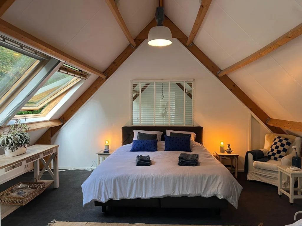 Overnachten in de sfeervolle kamer boven de huiskamer. Een groot tweepersoonsbed en 2 eenpersoonsbedden staan hiervoor klaar. Ook zijn er in de buurt van In ’t Bos de mogelijkheden tot slapen bij bijvoorbeeld Hotel de Klepperman in Hoevelaken of bij van der Valk hotel in Leusden. Ook kun je lekker eten in Hoevelaken bij de Huiskamer van Hoevelaken; eetcafé de Foep.