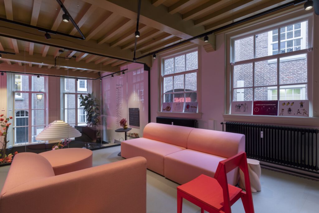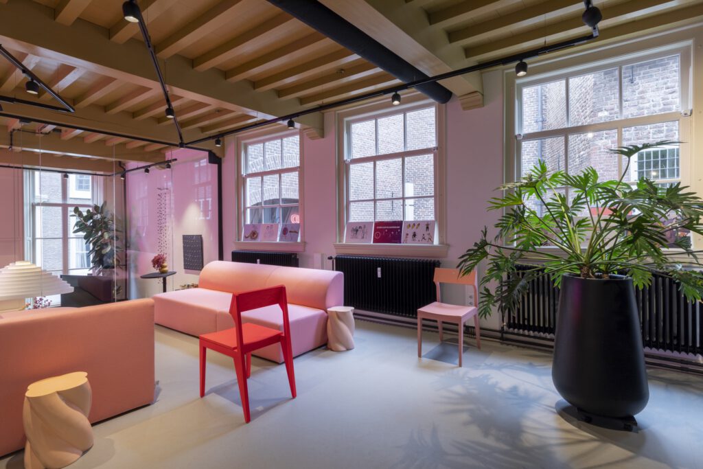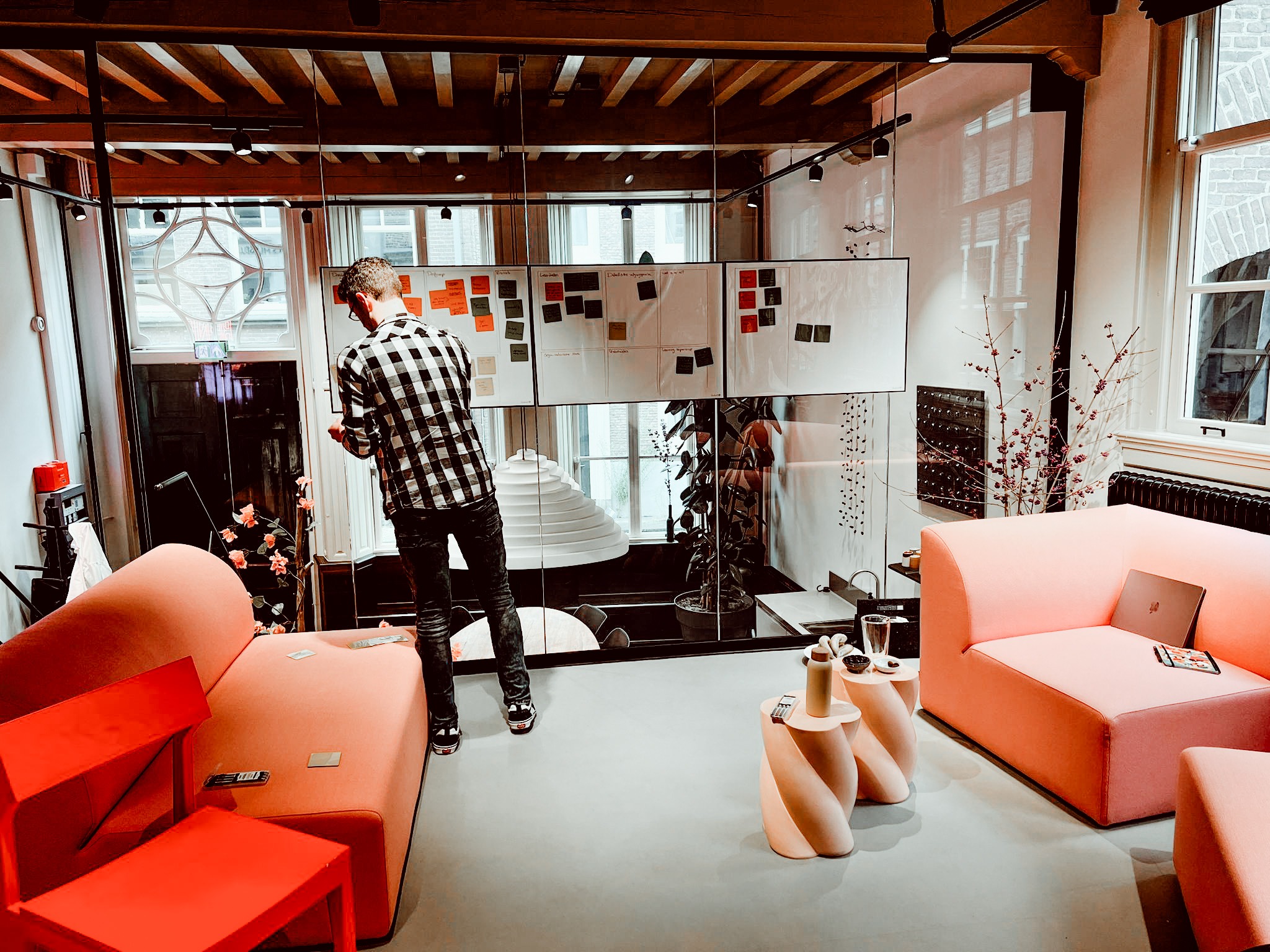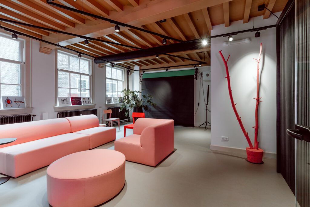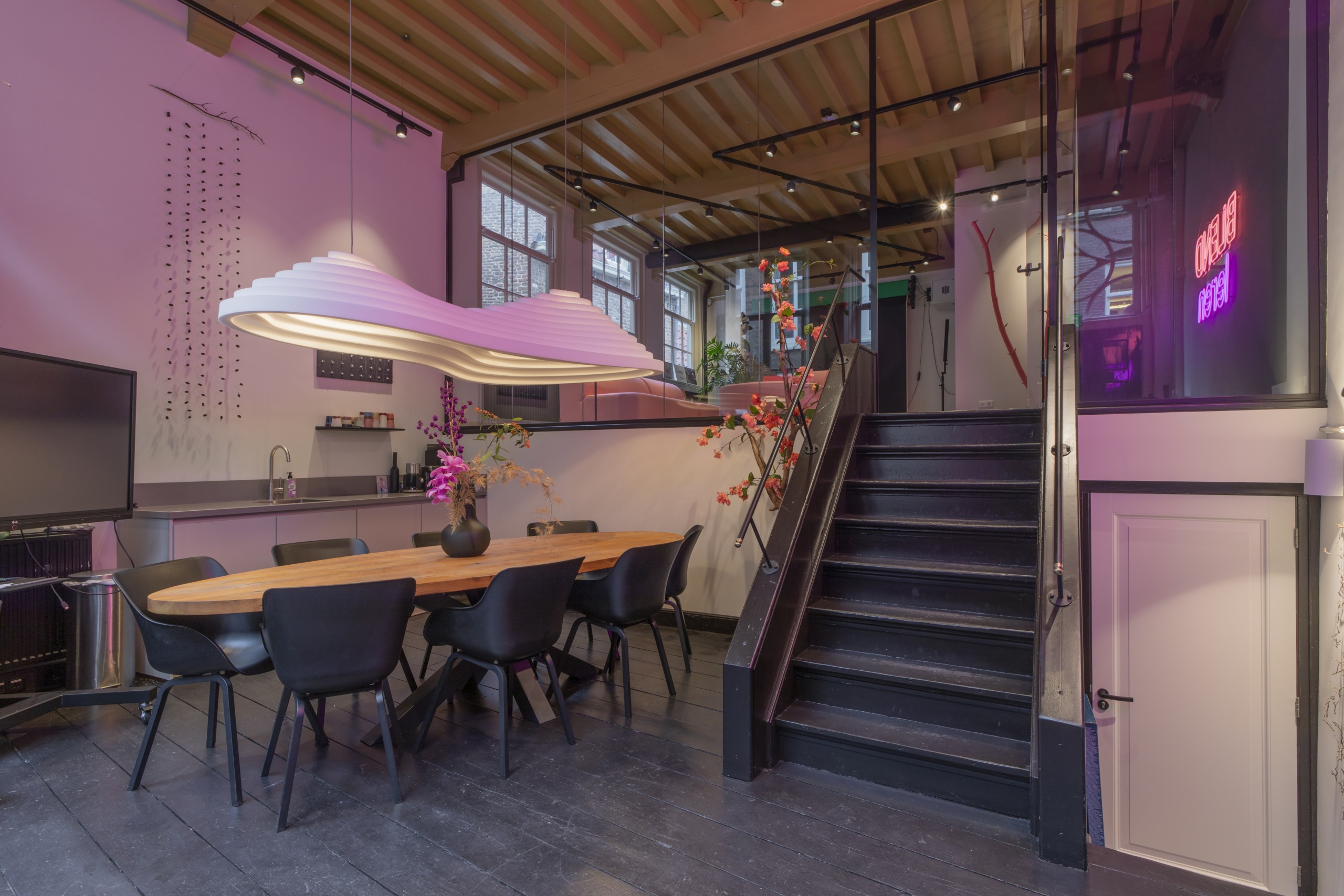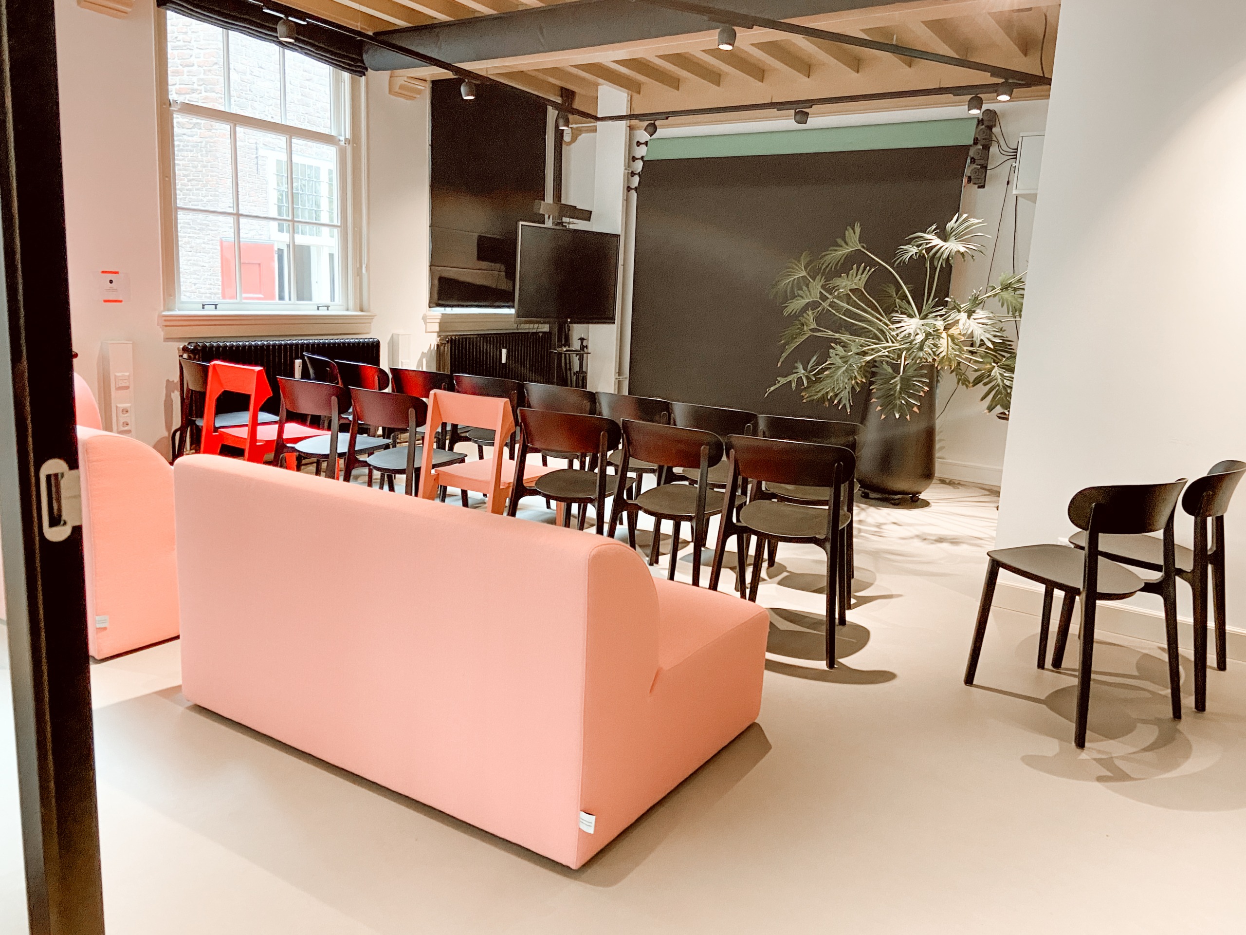 Via de originele voordeur sta je direct in de vergaderruimte. De wc’s bevinden zich in het souterrain. De ruimte bestaat uit twee delen (splitlevel). De voorzijde is een vergaderruimte met een houten ovale tafel (circa 8-10 personen) en een keukenblok. Er is een flipover en een groot verrijdbaar beeldscherm met camera, en WIFI. Het achterste deel is te gebruiken als trainings/brainstorm/loungeplek, of break-out room. Ook kan deze ruimte als film of fotostudio worden gebruikt (er zijn achtergrondrollen aanwezig). De ruimtes zijn van elkaar gescheiden met een glazen wand. We verhuren de twee ruimtes samen als een geheel.